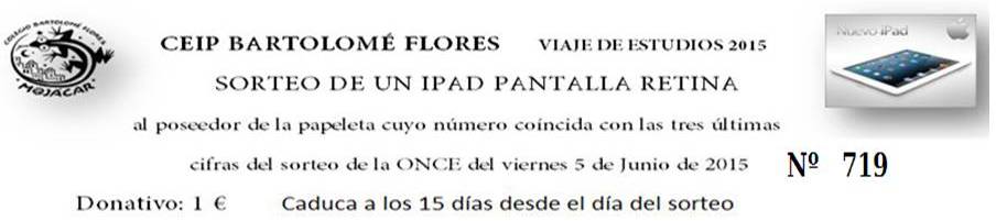 La papeleta ganadora del sorteo del Ipad para colaborar con los niños/as del viaje de estudios que se celebraba el día 5 de junio de 2015, ha sido el número 719. Podéis comprobarlo en el siguiente enlace: Sorteo de la once